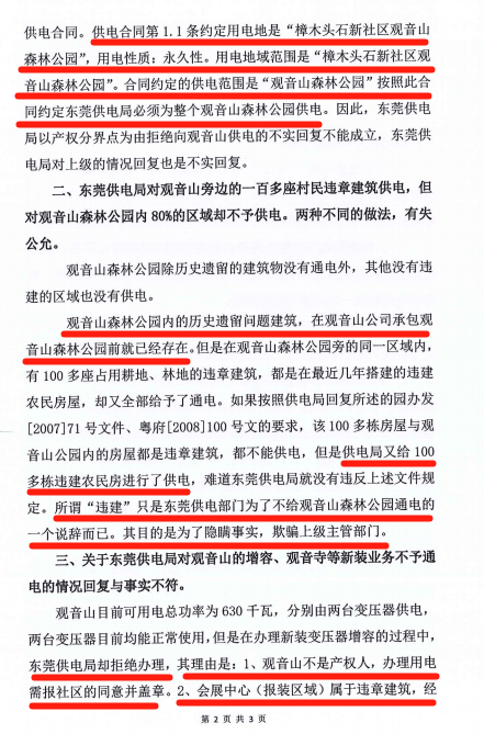 观音山公园认为广东电网有限责任公司东莞供电局虚构事实,因此不服其给予的回复,并于11月1日再次向广东省纪委递交了书面材料《关于东莞供电局2023年10月7日不实回复及推卸责任的情况反映》。