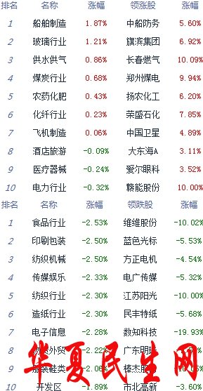 从盘面上看,国防军工、航运、燃气水务板块涨幅居前,白酒、汽车、食品加工制造板块跌幅居前。