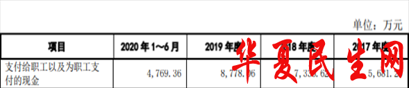 2017年至2020年上半年,公司支付给职工以及为职工支付的现金分别为5681.23万元、7336.62万元、8778.06万元、4769.36万元。