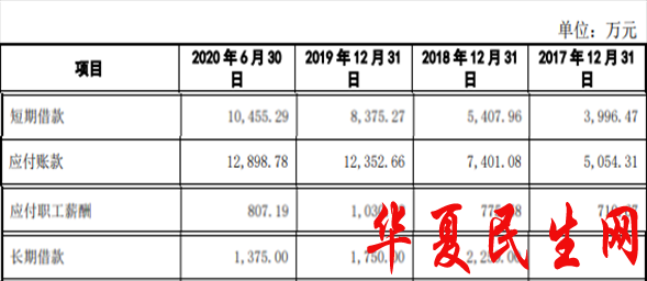 2017年至2020年上半年,公司短期借款分别为3996.47万元、5407.96万元、8375.27万元、1.05亿元;应付账款分别为5054.31万元、7401.08万元、1.24亿元、1.29亿元;应付职工薪酬分别为710.67万元、775.58万元、1030.38万元、807.19万元;长期借款分别为0元、2250万元、1750万元、1375万元。