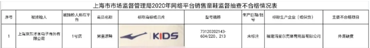 其中,不合格情况表第1项显示,由上海京东才奥电子商务有限公司在1号店销售的、标称由福建鸿星尔克体育用品有限公司生产(或供货)的男童凉鞋(型号规格:73120202143-604/220、213;生产日期/批号:未标注)不合格,主要不合格项目为外底硬度。