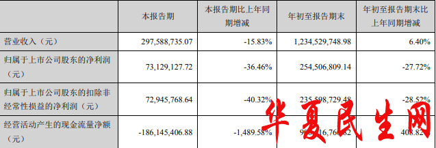 2020年1-9月,公司营收达到12.35亿元,同比增长6.40%;归母净利润2.55亿元,同比下降27.72%;扣非净利润2.36亿元,同比下降28.52%;经营活动产生的现金流量净额9.01亿元,同比增长408.82%。