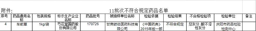 本次检查发现,由甘肃岐伯医药科技有限公司销售、芍花堂国药股份有限公司生产的车前草不符合规定。该产品包装规格为1kg/袋,药品批号170726,检验依据为《中国药典》2015年版一部,不合格检验项为总灰分;酸不溶性灰分,检验单位为庆阳市药品检验检测中心。