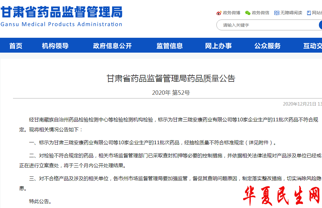 上述检查结果显示,经甘南藏族自治州药品检验检测中心等检验检测机构检验,标示为甘肃三陇安康药业有限公司等10家企业生产的11批次药品不符合规定。