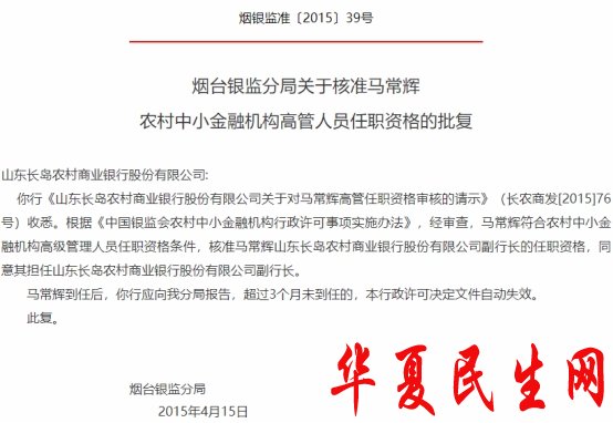 2015年4月15日,银保监局网站披露了《烟台银监分局关于核准马常辉农村中小金融机构高管人员任职资格的批复》,核准马常辉山东长岛农村商业银行股份有限公司副行长的任职资格,同意其担任山东长岛农村商业银行股份有限公司副行长。
