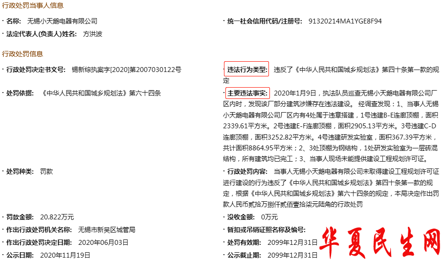 小天鹅电器主要违法事实如下:“2020年1月9日,执法队员巡查小天鹅电器厂区内时,发现该厂部分建筑涉嫌存在违法建设。经调查发现: