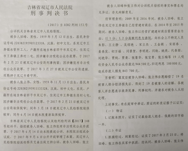 双辽市法院做出的(2017)吉0382刑初153号刑事判决书称:“被告人田峰和张立伟对公诉机关指控的事实和罪名均无异议,亦无辩解意见。经审理查明:2009年至2016年间,被告人田峰、张立伟在双辽市王奔镇自己经营建材商店。在2014年至2015年期间,被告人田峰、张立伟以经营扩建建材商店需要资金为由,以1分、1.2分高额利息为诱饵,向社会上不特定人员朱影、王立静、吴绍艳、宋立杰、王金娟、宋丽春、姜春发、初万福、闫景贺、李明亮、闫铁、姚亮、代春丽、刘艳华、贾纯、贾青、张景华、张宝贵、张玉梅等19人吸收资金人民币公众存款达944500元,归还利息100800元,造成存款人损失843700元。