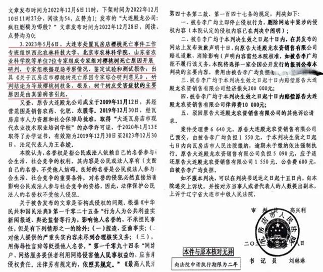 记者从李广军处看到了这份判决书后,不禁感到细思极控。判决书所称的名誉侵权稿子主要有:《大连瓦房店:樱桃树遭无声屠杀谁是凶手》、《大连瓦房店:“樱桃姐姐”温柔的残忍只顾赚钱?》、《大连殿龙公司:疯狂删稿为哪般?》、《大连瓦房店:樱桃事件考验公权力,是进是退?》。但是,判决书中并没有实质性的证据能够证明构成名誉侵权。其前面罗列的都是大连殿龙的一些所谓业绩和做过的一些好事,而对于李转发稿子所依据的主要证据连提都没提。案涉文章的主要证据有:针对樱桃姐姐6#全能型涂干营养液的《分析报告》、鞍山绿洲林木果业技术鉴定有限公司出具的《技术鉴定意见书》和《信访事项处理意见书》等。