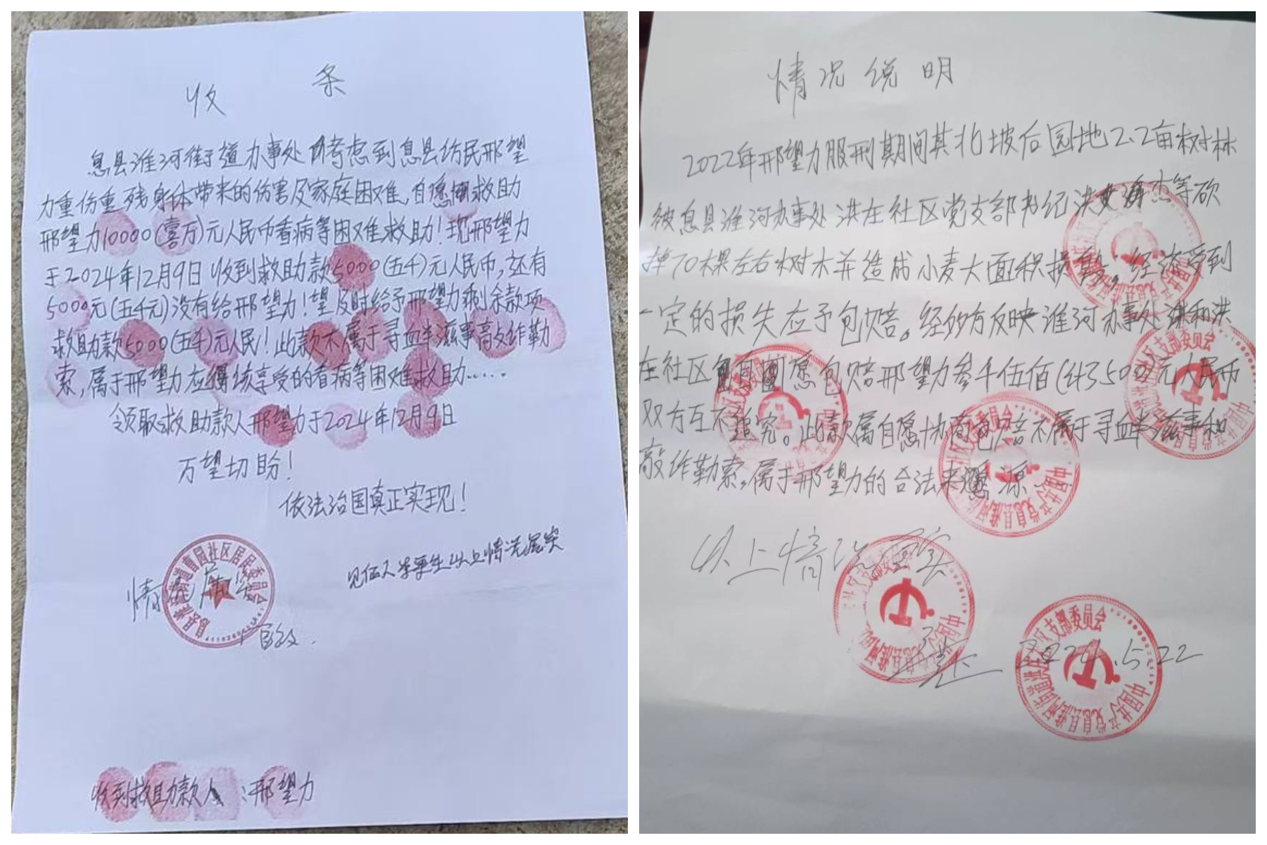 对此,邢望力的儿子邢鉴日前对大纪元表示,“他毁坏我家的地,把青苗给压坏,是不是应该赔偿?当时赔偿都是盖了公章的。村党支部书记开着挖机去我们家一顿挖,把树根给铇了,把小麦毁坏了,然后他们就赔偿了,这个事就过了。”