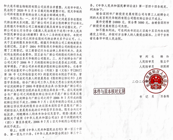 大连百利天华制药有限公司(以下简称“百利公司”)成立于2003年6月3日。截止2005年9月10日,百利公司的股东有:深圳市广新投资发展有限公司(广新公司)、吉林省白河林业局、刘晓娜(现张洪刚)。其中吉林省白河林业局作为国有企业,持有百利公司30%股权。因此,百利公司的合法权益与国有资产有着密不可分的联系。