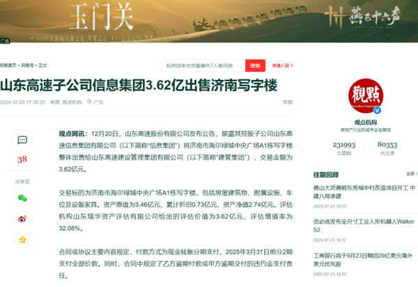 公开信息显示,2024年12月,山东高速信息集团以3.62亿元价格,将济南海尔绿城中央广场A1栋写字楼转让给同属山东高速集团体系内的兄弟公司山东高速建设管理集团。随后该公司披露的2024年财报显示,全年净利润达3.69亿元,同比增长17.89%,但同期营收仅增长2.5%,主营业务增长态势相对平缓。值得注意的是,涉事写字楼资产原值3.46亿元,累计折旧0.73亿元,净值2.74亿元,此次交易评估增值率达32.08%。2023年,信息集团将委托下属单位运营仅2年的北斗新时空产业园产权过户至全资子公司,这样的左手倒右手又是为了什么呢?