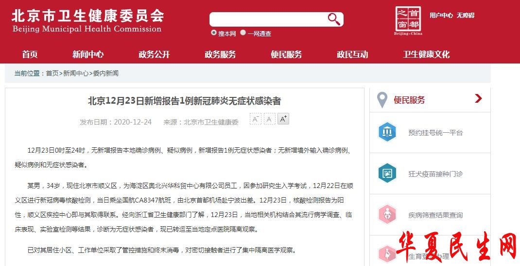 中国网12月24日讯 据北京市卫生健康委员会网站消息,12月23日0时至24时,无新增报告本地确诊病例、疑似病例,新增报告1例无症状感染者;无新增境外输入确诊病例、疑似病例和无症状感染者。