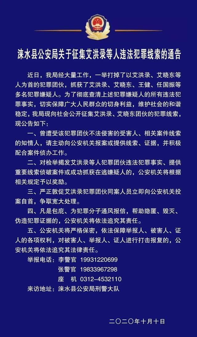 《北京青年报》记者蒋举在采访过程中发现除破坏水利设施行为之外的黑恶势力犯罪线索,于是向公安部扫黑办、河北省纪委实名举报。随即,涞水县纪委、县公安局迅速出手,将嫌疑人艾某录等团伙成员抓获归案,已经查实艾某录涉嫌诈骗、暴力催贷、寻衅滋事、故意伤害等违法犯罪行为,涉及犯罪嫌疑人十几名。