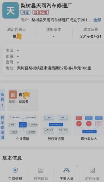通过网上检索可以看到,梨树县天雨汽车修理厂于2014年7月注册成立,注册地址为:梨树县梨树镇霍家店四期B2号楼4单元108室;法定代表人为:夏某;经营范围包括车辆维修兼配件零售。