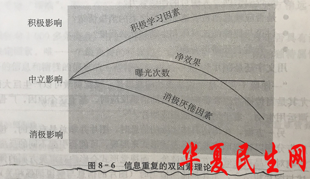 如下图信息重复的双因素理论所示,随着曝光次数的增加,消费者的积极影响不断扩大,但当超过一定数量,消极影响将快速扩大,最终让净效果变差。