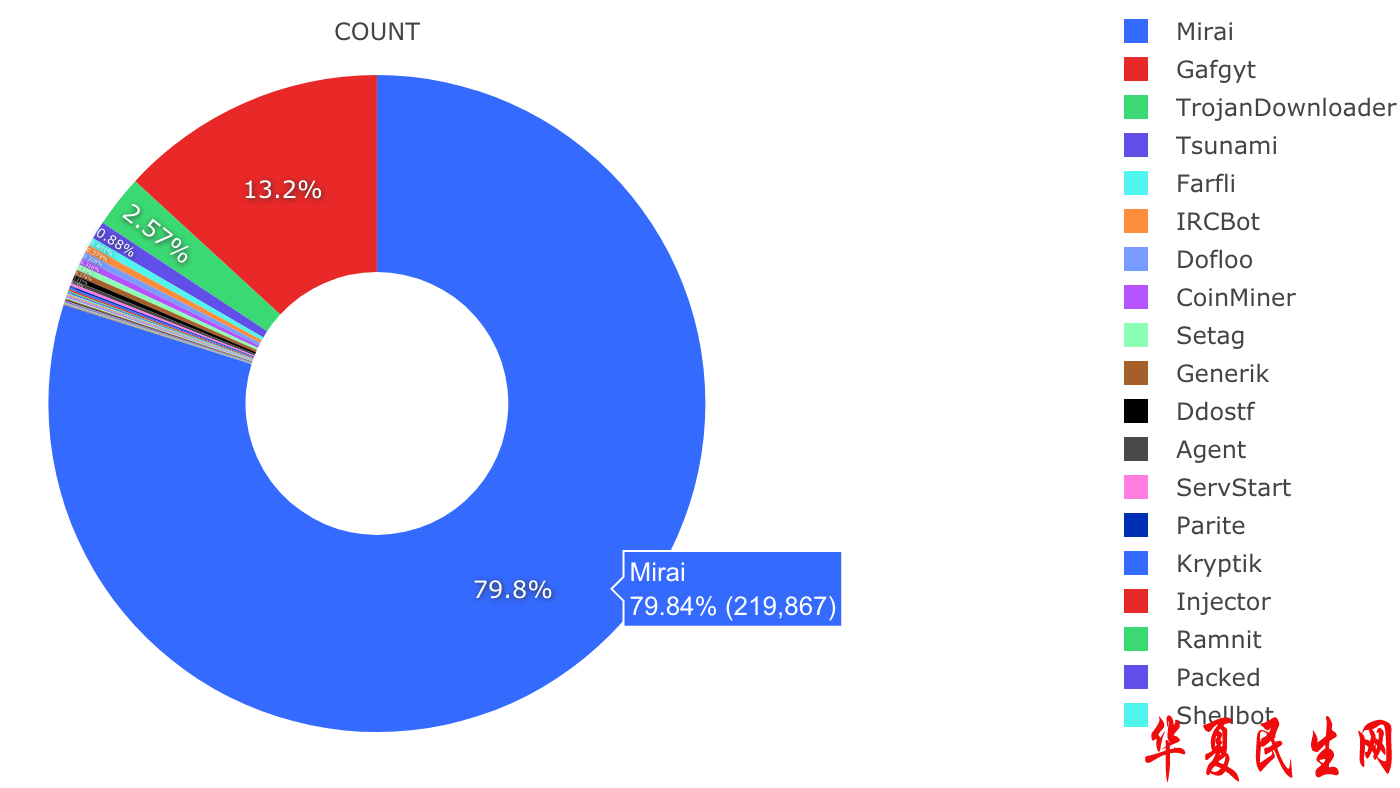 此外,360网络安全研究院捕获54万个可执行文件样本,识别出89种恶意软件家族,其中Mirai和Gafgyt僵尸网络家族样本分别占比79.8%和13.2%。
