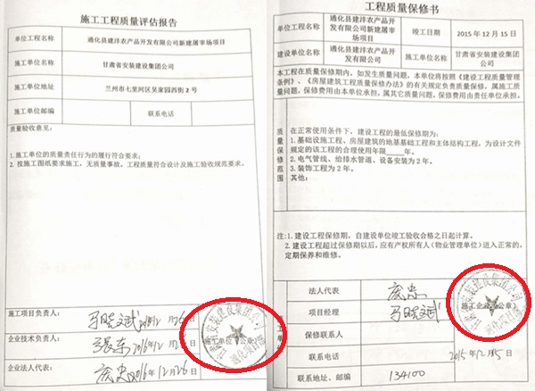 3、作为承包施工单位,不但违法转让了全部工程,对中标工程放任自流,还将公章(项目部公章),文件签署权等应由承包单位亲力亲为的事宜,全部交予建设单位行使,对承建的工程极不负责任,任由建设单位伪造工程竣工、验收、备案等材料,其行为涉嫌与建设单位相互勾结、串通,伪造公文,骗取国家的补贴和对工程质量的监管。按照《中华人民共和国建筑法》第二十六条的规定,“承包建筑工程的单位应当持有依法取得的资质证书,并在其资质等级许可的业务范围内承揽工程。禁止建筑施工企业超越本企业资质等级许可的业务范围或者以任何形式用其他建筑施工企业的名义承揽工程。禁止建筑施工企业以任何形式允许其他单位或者个人使用本企业的资质证书、营业执照,以本企业的名义承揽工程。”依据上述规定,甘肃安建的行为,严重扰乱了吉林省范围内乃至全国的建筑市场。