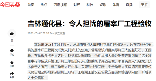 2021年5月18日,深圳市赛格大厦的摇晃事件刚刚发生,远在吉林省通化县的屠宰厂工程再次成为人们关注的焦点。曾经是该项目实际施工人的赵红石、王国新,在举报多次无果之后,找到本站编辑部,他们举出大量证据并详细列举了这个项目中标单位放弃管理,施工单位的法人授权委托书弄虚造假,项目负责人马晓斌、技术负责人张东、施工负责人任小凤、专职质检员文雅、安全负责人漆应德等重要岗位人员自始至终均未到过施工现场,工程完工后又在验收方面造假等诸多问题,听后令人十分震惊。