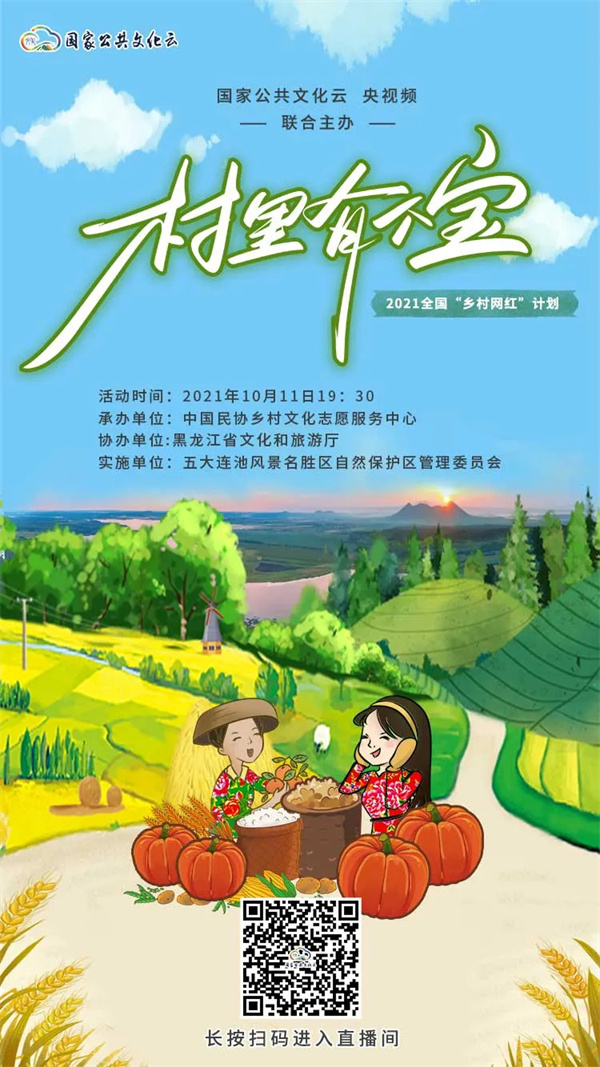 2021年10月11日19:30,由文化和旅游部全国公共文化发展中心中央广播电视总台视听新媒体中心联合主办,中国民协乡村文化志愿服务中心承办,黑龙江省文化和旅游厅协办,五大连池风景名胜区自然保护区管理委员会实施的“乡村网红”培育计划 走进神奇的五大连池将在国家公共文化云进行直播。