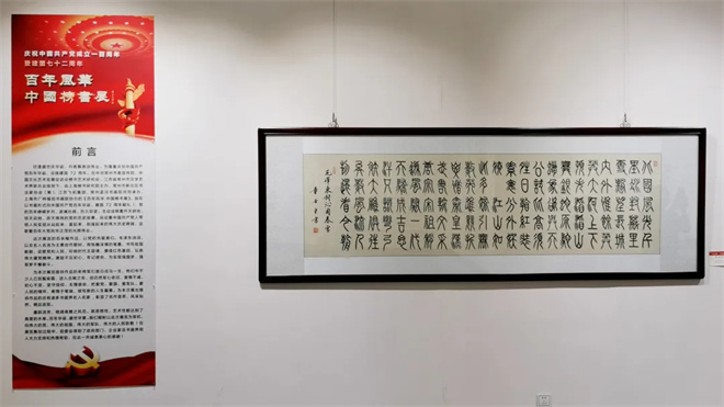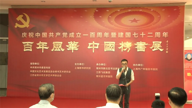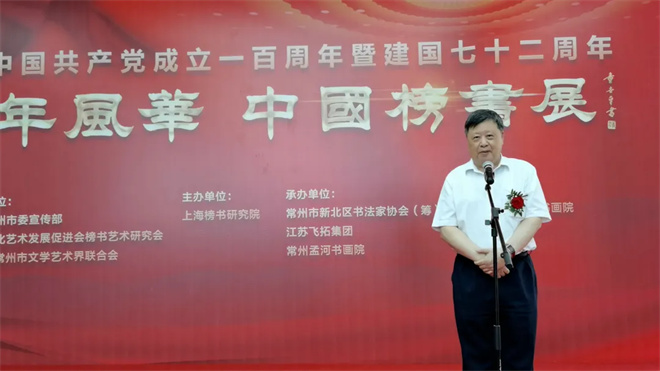庆祝中国共产党成立100周年   喜迎建国72周年,由上海榜书研究院主办,在常州市市委宣传部、常州市文学艺术界联合会、中国文化艺术发展促进会榜书艺术研究会等部门的指导下、由常州新北区书法家协会、江苏飞拓集团、常州孟河书画院联合承办,上海广种福田书画院协办的《百年风华 中国榜书展》9月28日在常州刘海粟美术馆隆重举行。