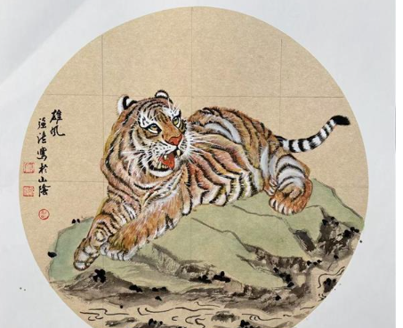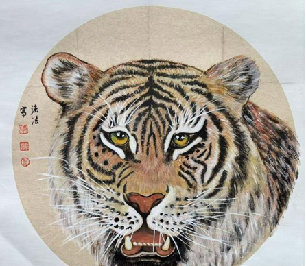 在创作手法上,陈强法巧妙地将传统与创新相融合。他用灵动且富有力度的线条勾勒老虎的轮廓,每一根线条都仿佛蕴含着生命的力量,精准地描绘出老虎坚实的肌肉、矫健的四肢和挺拔的骨骼,让人感受到百兽之王的强大体魄。而在描绘虎毛时,他的笔触又变得细腻入微,根根虎毛清晰可见,仿佛能让人触摸到其真实的质感,这些细腻的笔触赋予了老虎鲜活的生命力。