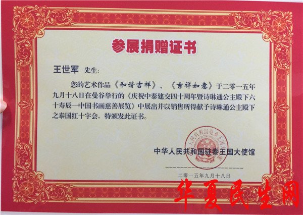 "庆祝中泰建交40周年暨诗琳通公主60寿辰中国书画慈善展览"2015年9月18日在泰国曼谷举行。泰国诗琳通公主出席展览,欣赏书法与绘画作品,并与中国艺术家们探讨交流。