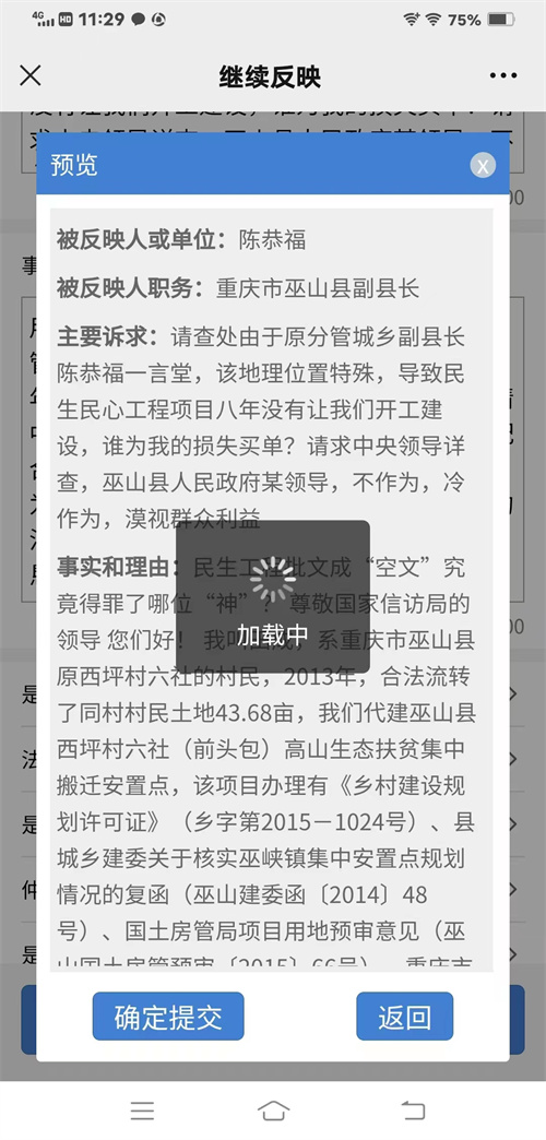 田某在办理施工许可证的道路上可谓是坎坷至极,巫山县建委也是笑脸相迎有头无尾,同样的手续巫山的其他民生工程安置点正在热火朝天施工中。田某经熟人联系到了时任巫山县分管城建的副县长陈某,得到的答复是:(该地理位置特殊)(巫山方言:莫空掏力,书面语言:白费功夫)。无奈之举民生项目负责人被迫走上了信访路线索要结果,据2021年6月11日上午九点半巫山县信访办公楼巫山县党政领导干部接待群众登记表内容显示,诉求已建成房屋办证,基础设施,后续建设等内容反应到巫山县信访局。得到的结果仍然是石沉大海。
