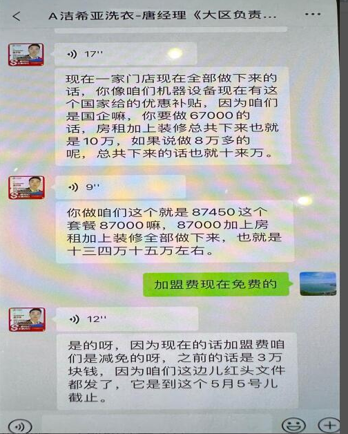 4、加盟北京洁希亚遭骗局,被业务员忽悠一步步往外掏钱