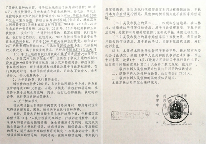 农安法院在其做出的(2020)吉0122执监1号裁定书中称:“本院根据查明的案件事实认为:(一)吴俊和要求恢复本院的951号执行回转裁定的信访请求不能成立。理由如下:1、关于争议土地的控制权。(1)吴俊和未取得争议土地的经营管理权,其主张回转无权利基础。根据现有证据,不能认定吴俊和已取得争议土地的经营管理权……即争议土地(在行政分界线以西)不在承包合同范围内,吴俊和要求执行回转没有合同以及生效法律文书确认的权利依据。(2)执行后,争议土地的控制权在双方之间已多次变动,执行改变的状态已经恢复过,现已无执行回转必要……也就是说,2002 年被法院执行改变的争议土地的控制权,早已于2004年被吴俊和自行恢复,即自该时起,已恢复到执行前状态,已无执行回转必要。至于之后控制权又被改变,属于新发生的状态,已经与法院执行行为无关。(3)争议土地控制权归属裁决不属于司法范畴,执行不宜介入……也无权介入,介入也解决不了。”法院裁定:“驳回吴俊和要求执行回转的信访要求。”
