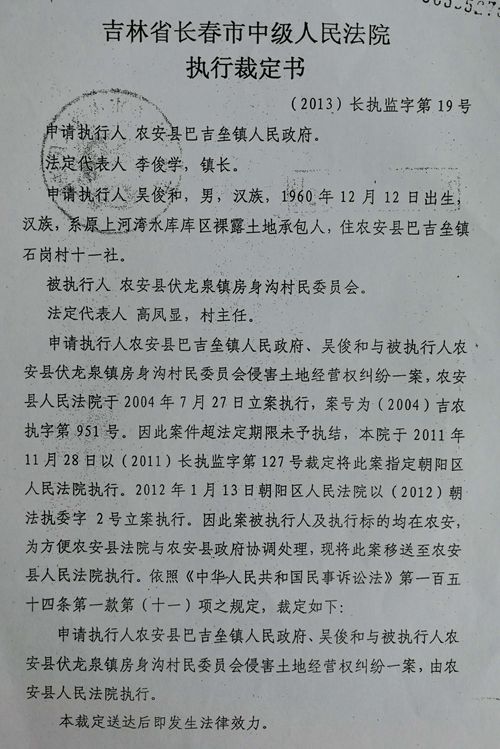 从2004年7月27日以后,吴俊和与巴吉垒镇政府就开始要求农安县法院执行回转,县法院依据(2004)长民再字第17号民事裁定书,做出(2004)吉农执字第951号民事裁定,裁定被执行人伏龙泉镇房身沟村立即停止在上河湾水库183.5米等高线以下淹没区裸露地48.36万平方米的耕种,返还诉讼费和执行费2900元,支付树苗折价款及利息62647.2元。但是由于受到一些说不清道不明因素的干扰,该裁定没有得到实际执行。
