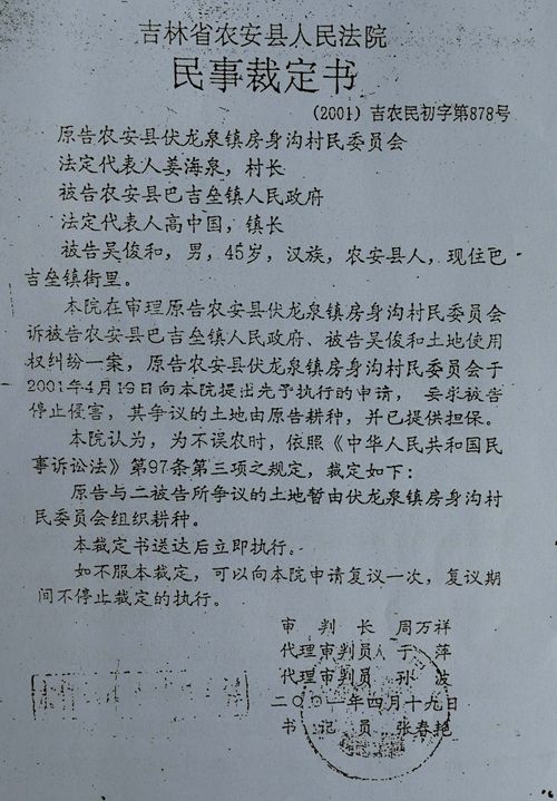 令人感到不可思议的是,在县政府早已经将此块地确权给了巴吉垒镇政府,而且县法院也早就做出过行政判决之后,农安县法院换成房义当院长后,却无视这一切的存在,法官周万祥居然在判决前,于2001年4月19日做出被上级法院认定违法的(2001)吉农民初字第878号民事裁定书,先予执行案件标的物,将争议的土地暂由伏龙泉镇房身沟村组织耕种。2001年8月14日,其又做出(2001)吉农民初字第878号民事判决书,判令巴吉垒镇政府、吴俊和立即停止对伏龙泉镇房身沟村民委员会对双方所争议的土地经营权的侵害。之后,法院按照行政界限把完整的水库分割开来,使孙文一伙人霸占了800多亩库区地……