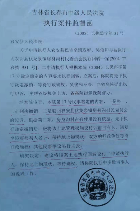 对此,吴俊和十分不解,在他看来,这就是睁眼说瞎话,揣着明白装糊涂:既然没有可执行回转内容,上河湾800多亩裸露地哪里去了?没有可执行回转内容,法院为什么做出先予执行的裁定了呢?农安县法院早在1997年就做出了农行初字第26号行政判决书,长春市中级法院2004年也做出了(2004)长民再字第17号民事裁定书等等法律文书,难道这一切都不生效吗?到了该执行回转的时候,法院却说“对土地确权不属于法院管辖事项”。既然不归法院管辖,农安县法院2001年春为什么急着下裁定先予执行呢?农安县法院有权撤销上级法院合法的生效判决和裁定吗?到目前为止,上级法院下发的都是令其执行回转的判决和裁定,从来没有下达过任何判决或者裁定令其撤销上级法院的裁定和判决,而农安法院居然就以下犯上的撤销了上级法院的裁定和判决,这不是明目张胆的以权抗法吗?