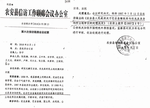 2018年8月1日,农安县政府专门召开了信访工作第六次联席会议,决定维持1997年7月12日县政府做出的农府土裁字(1997)8号裁定。此次信访联席会议再次确定了巴吉垒镇政府对库区地的管理经营权,也就是再次确认了吴俊和承包经营库区地的合法性。但是,农安县法院至今仍没有执行回转。